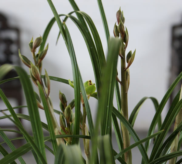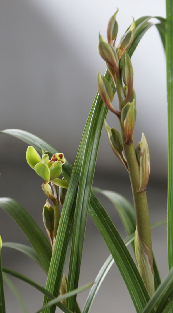 说明: 赤壳类绿花梅瓣,民国时江苏宜兴顾同荪选出,抗战前流传日本。叶,中阔半立,叶长一尺五、六寸,叶肉肥厚。花,外三瓣长脚圆头,厚肉紧边,合背半硬捧心,尖如意舌,红块鲜艳,一字肩,花色尽绿。花梗高出叶上, 小花茎赤紫色,花梗粗长,高约五十公分,每梗着花七、八朵。本品在国内留存甚少。上世纪90年代初,才从日本大量返销,为稀少品。拍摄于2011年4月9日。