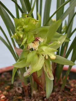 浅,新叶叶缘内卷,老叶叶缘呈背卷状。叶色黄绿,叶缘锯齿细密,偶有叶中脉偏离叶中,叶质软,糯润。叶背中脉两侧有多条细脉达梢。新叶有亮光,叶梢尖如针。叶脚紧收,假球茎圆大,叶片可达七八片以上。新芽刚出土为白绿色,逐渐成淡绿色,有浅紫纹,芽壳尖有细小白米粒样物,新叶也有。叶甲细长,甲尖较软。花苞刚出土时,从底往上由白转浅绿色,见阳后转为绿色带紫晕,筋麻紫红色,苞尖也有细小白米粒物,花苞下部逐渐圆鼓。放花前花苞臌大,贴肉苞衣淡绿色,紫筋到梢。花葶绿色粗矮,10--15cm左右。外轮花瓣增多,呈宽竹叶瓣向四周放射,内轮花瓣层层迭迭,无明显捧瓣与蕊柱,花的内轮着生数