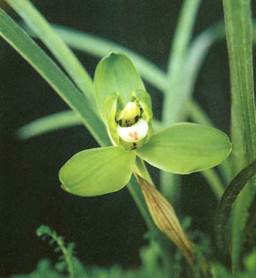,10cm左右呈淡红色,茎节深红色。外三瓣极圆大,收根细,瓣端有勾锋,瓣质糯厚,花色具筋纹,绿色,主瓣紧边,呈上盖兜扣状