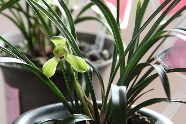 该品种叶呈弓形,叶宽1.1厘米~1.3厘米,长26厘米~32厘米,叶缘锯齿细密,叶尖稍钝,叶青绿色,丰润,有光泽,株型柔美。其苞叶绿色,苞叶上有深绿筋纹,颜色由外及里一层比一层淡。三枚萼片长脚收根,青绿色,光泽好,质地厚,紧边,前部圆大,汤匙状,呈兜型,头部乳白色。两捧瓣紧闭,将蕊柱完全罩住。大如意舌,色如白玉,舌缘上翘,收成朝上的浅兜状,内有艳丽的元宝形状红斑,端庄,非常好看。此兰开放时花梗细长,高约10厘米~12厘米,微落肩,有时也会出现平肩,花开耐久,为不多见得真正绿花绿莛的品种。 |