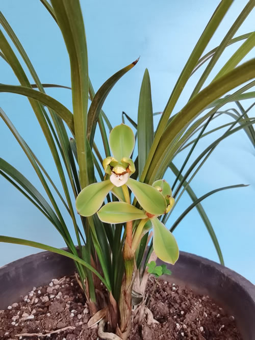该品种花微落肩,花型略小,宽大圆结的外三瓣与略紧蹙的中宫形成的整体协调性不够理想,是此花的瑕疵。然瑕不掩瑜,以九龙梅瓣质之厚实,瓣色之翠绿,色泽之清丽,花守之上佳,足以让九龙梅位列春兰梅瓣新花之佼佼者的地位。