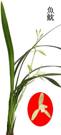 鱼魫兰,假鳞茎近似球形;出土新叶芽洁白晶莹,日后逐渐转谈青绿色;时鞘随着新芽的发育,日益长高;叶柄环状;叶基窄,中部宽大,端部肥大,钝尖收尾;上部叶面常有双箭样叶沟,新叶面有十分明显的龙骨节状的绿色斑纹,老叶侧脉黄亮,犹如黄色线段状线艺;株叶3~5片,常为4片,长35~55厘米,宽0.8~1.9厘米;叶基开幅度约45度;叶缘比叶面浓绿;叶齿匀细而锐利;片片叶形不一,叶态斜立,株形潇洒。