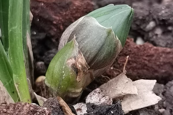 绿云的花蕾形似木鱼锤,浑圆,端正。苞壳水银红色,上缀紫红粗疏条纹,锋尖有绿沙晕;苞片阔大,淡绿色,绿彩浓艳,沙晕如雾全包花蕾,花蕾形似木鱼锤,有绿沙晕。绿云花葶较矮,约6~8厘米,花梗粗圆,紫红色,顶节渐转淡绿色。绿云着花1~2朵,易出双花。其花朵中等大小,花直径约5~5.5厘米,一朵在正面,另一朵在侧面或反面,多姿多彩,变幻莫测。其花瓣短圆,紧边,收根放角,花瓣通常不厚,极似荷花花瓣,花色湖绿,十分娇艳。花瓣可增生至4~6枚,有时花瓣上会出现蝶化,蝶化部分有的向内卷曲,上缀紫红色点斑纹,非常美丽。