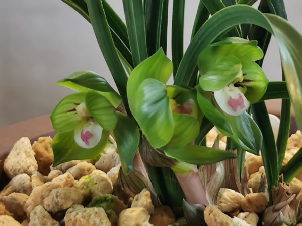 捧瓣如蚌壳,内侧有深紫红放射状条纹,可增生至3~4枚。唇为大圆刘海舌,舌上有淡红斑,也常有变化。有时会演变成双舌或三舌,白黄色,圆而放宕,上缀有“U”字形橙红色斑;也会出现双蕊柱或蕊柱演变成硬兜形,姿态十分优美动人。绿云因其瓣型被列入春兰荷瓣类中,由于萼片(栽培者常称花瓣)、捧瓣、唇瓣多变,故亦可列入奇瓣型之列。绿云花虽不高,但叶姿,花形,幽香,综合起来,并不影响整体观感,令人喜爱。