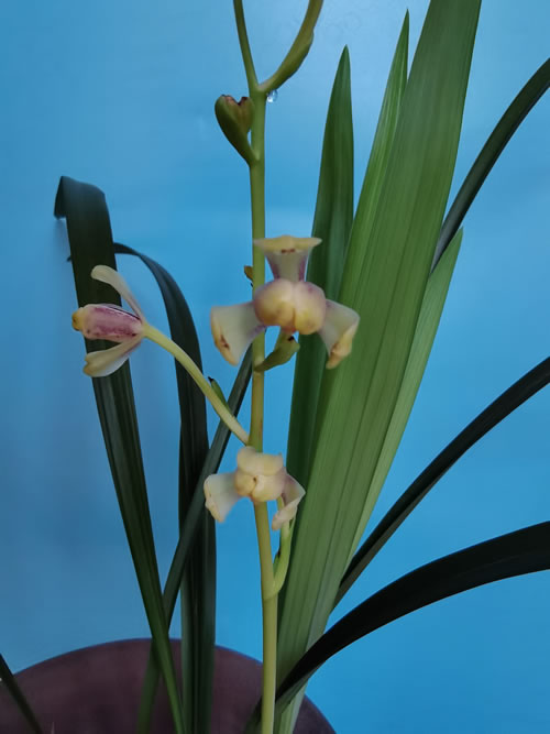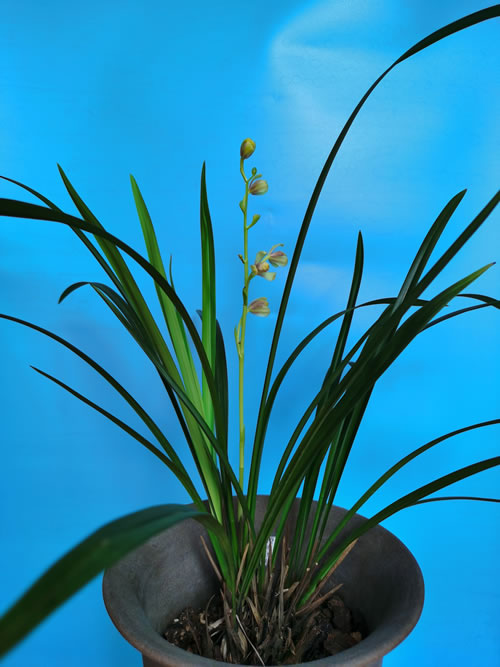 从叶型上看,该品种每株有二至四片叶,叶半直立,单叶长20~55厘米,宽1.3~1.5厘米,叶面平,常无光泽(阴养则有光泽)。 其易花。花秆细而坚,常平架而开。每杆可着花八朵,但时有开不出者。与蕙兰相仿,每朵盛开花花柄根部均有
