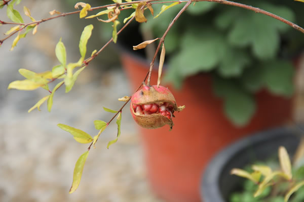 微型石榴花、果观赏期特长,每朵花从出现红色花蕾到果实成熟,自春经夏到秋近冬几个月,一直悬挂于枝头。微型石榴极易造型,最适合盆栽。它果枝自己封顶,不需人工矮化,堪称盆景石榴一奇葩。