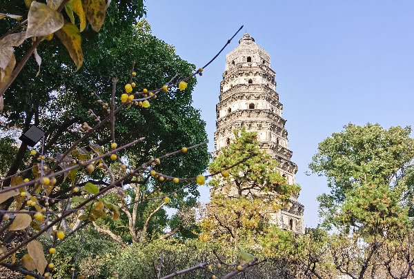 冬日,蓝天映衬之下,姑苏虎丘塔前,一树梅枝点点黄花,不与群芳争艳,只与清冷相伴,带来春的期盼,这就是腊梅。