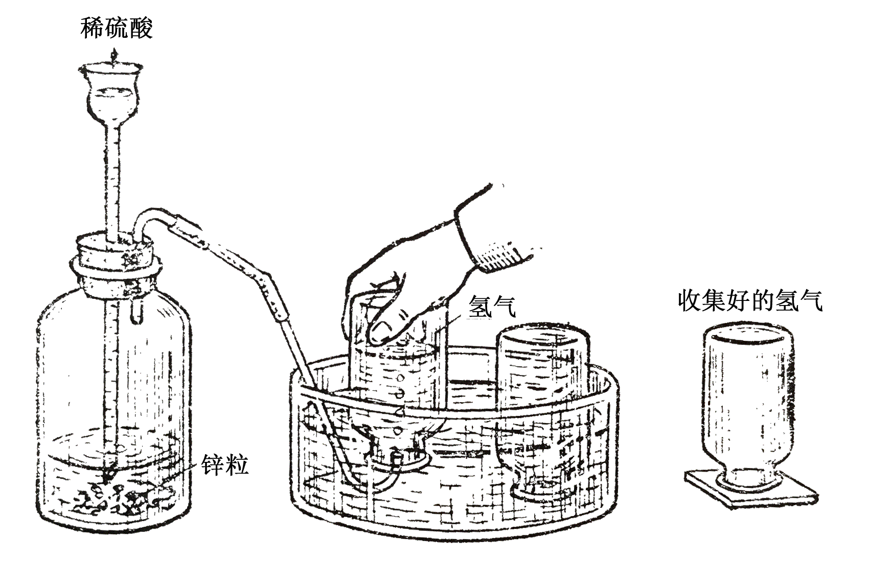 下图是在课堂上演示制取氢气的装置示意。左面瓶内放有少量鋅粒。当从长颈漏斗加进稀硫酸后,锌粒和硫酸发生作用,很快就有氢气从锌粒表面放出,用排水集气法可以把氢气收集在集气瓶里。