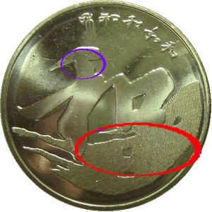 3.手感上,真币的齿边比较圆滑;假币齿边较粗糙。 4.真币字体较有立体感,假币则无,币面发黄;上面5个小和字与真币有差异。 5.真币“和”字如上图蓝椭圆圈内,有回峰顿笔,假币则无。