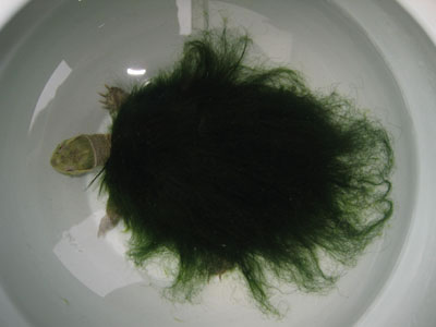 说实话,此龟除了绿毛外,不怎么样,主要是它不是地道的绿毛龟。在江南人的记载中,绿毛龟出自常熟兴福寺前的水潭中,以其文静飘逸养眼著称。白瓷盎中一团丝丝绿,想想都静而美。能如此,种龟必须是黄喉水龟。这龟文静,其它品种都不能达此境界。而老先生送我的却是草龟,故而浮躁,难得绿毛龟之趣。虽如此,这绿毛却是货真价实的。我查了下,是龟背基枝藻,这可是正宗的。有了这藻种就可自己培育绿毛龟了。于是几年下来,我获得了十只绿毛龟。想想都美。这不,正愁用啥吸引人,我的眼光就转到了这龟毛上。