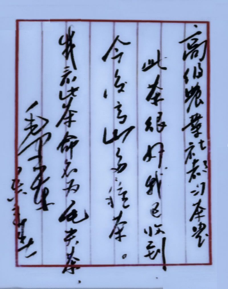 几天以后,茶农社收到一封落款为中共中央办公厅的回信。大家激动不已。信件是打字机打印的,大致内容是:你们给毛主席的茶叶已经收到,经主席批准,寄给你们十五元注作成本费,落款为中共中央办公厅。信件下部附有毛主席的亲笔回信:“此茶很好,我已收到。今后高山多种茶。我看此茶命名为毛尖茶。毛泽东”。
