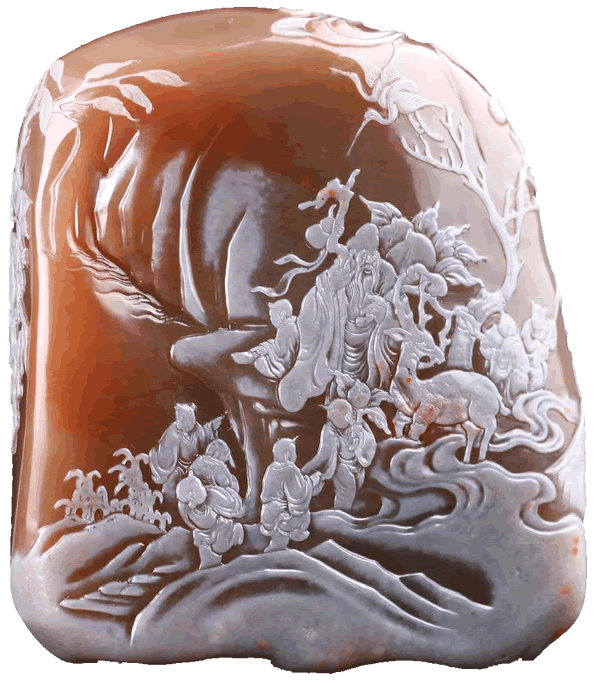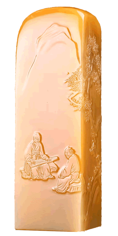 该章的薄意雕部分仿照清代薄意雕大师林清卿的雕刻技法,又加入了现代版画的风格。下面是清代林清卿大师的寿山田黄薄意章《雅聚》。