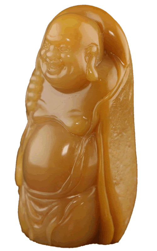 这是块用老挝北部黄雕刻的弥勒佛像,其色为正宗的枇杷黄。该作品从雕刻角度看,不属于上品,但颜色却很正。