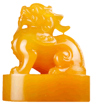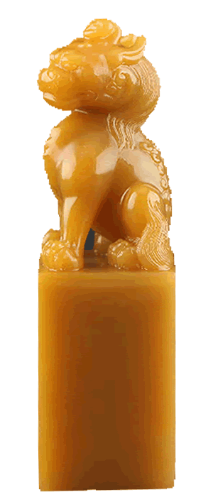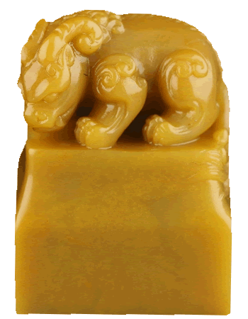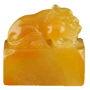 该章的材料为老挝田黄冻石,无萝卜丝纹。其色亮丽,属老挝黄金黄品种中色浓艳的品种。