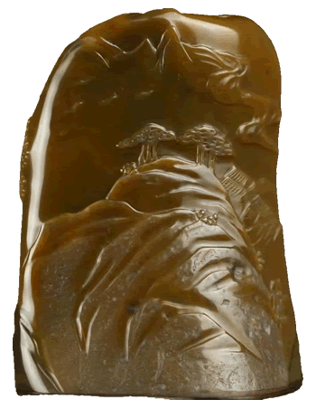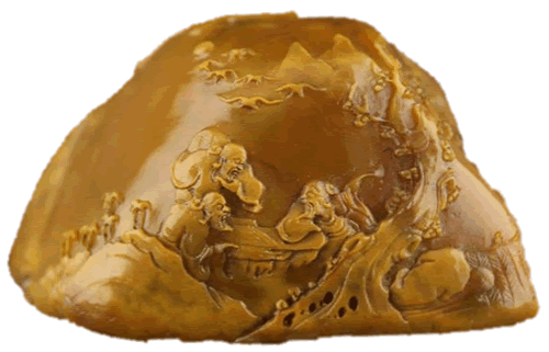 该作品由老挝南部田黄原石经薄意雕雕刻而成。作品描绘了隐者相聚在古松下的场景。其石质细腻,没有萝卜丝纹,透光效果良好。石色为黄金黄,是那种带有一定冻质感的黄金黄。