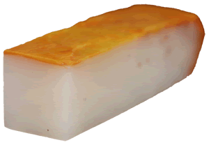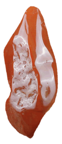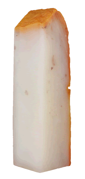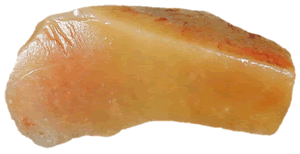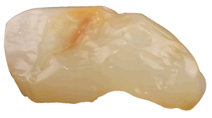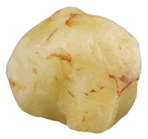 老挝田黄与寿山田黄一样,有许多外黄内白料,这是黄化不彻底的缘故。这种白芯料不能被归入白田,应按黄化的颜色归类。事实上,这种料与白田有根本区别。其黄化部分不是皮,而是肉被铁离子渗透后形成,黄白两部分颜色呈逐步过渡状;而白田则是外裹一层黄皮,黄白两部分呈皮肉分离状态,如下:
