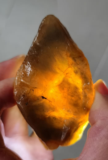 :因通透,可透过外层看到内部的黑田本体。该原石在暗处透光效果照片如下: