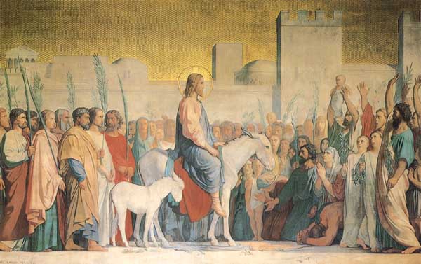这是描绘基督进入耶路撒冷城的作品。画家运用古典主义绘画手法,将人物处理得肃穆而富于理性,造型严谨。基督居于画面中间,骑着毛驴进入耶路撒冷,欢迎的人们没有通常的惊喜与兴奋,而更多的是一种惊奇与惶恐。用色单纯,分别为近景与中景,远景则是耶路撒冷城堡。画家将宗教题材以“回到中世纪”的绘画语言加以表现,更富于宗教理性特点。