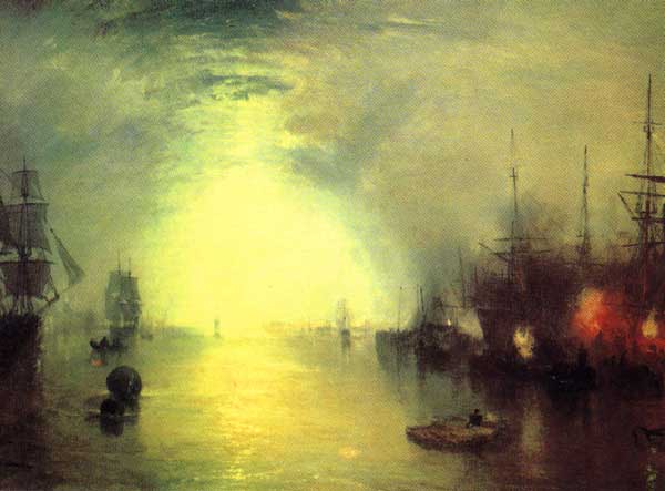 透纳描绘的这幅《月光下的煤港》,是他对大自然光色和空气变化的探索与表现。他把月光下的煤港描绘成光色变幻的朦胧轮廓与隐约飘忽的景色,轮船、煤港、夜空都没入到透光的烟霭之中。作品本身的主题已不再重要,只不过借其题旨来表现透明与反射的光的韵律而已,特别是透纳将工业形象——轮船、码头等纳入风景画之中,开一代风景画创作之先河,是一伟大贡献与创举。