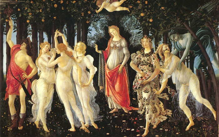 神话中的维纳斯是美丽的象征;也是一切生命之源的化身。波提切利笔下的维纳斯是代表生命之源的女神。画面右上方是风神,他拥抱着春神,春神又拥着花神,被鲜花装点的花神向大地撒着鲜花;画面中间立着女神维纳斯,在她头顶处飞翔着手执爱情之箭的小爱神丘比特;维纳斯的右手边是三美神手拉手翩翩起舞,她们分别象征“华美”、“贞淑”和“欢悦”,给人间带来生命的欢乐;画面的左方是主神宙斯特使墨丘利,他有一双飞毛腿,他的手势所到,即刻驱散冬天的阴霾,春天降临大地,百花齐放,万木争荣。这是一幅描绘大地回春,欢乐愉快的主题的作品。然而,画中人物的情态,画面并无欢乐之气氛,像春天里吹来一阵西北风,笼罩着一层春寒和哀愁;若有所思的维纳斯,旁若无人,进入自己的内心世界;三美神的舞姿似乎是受命起舞,颇有逢场作戏的感觉,令观赏者不解。自文艺复兴始,人文主义精神渗入文艺创作,画家往往借助于宗教神话题材和神的形象,寄托自己对社会、自然和人生的思想情感,传达自己的理想,在波提切利所塑造的艺术形象中,都寓含着对现实的惶恐不安。画家当时体弱多病,抱病从命作画,这种心境所创造的艺术形象自然也就忧郁哀伤了。 |