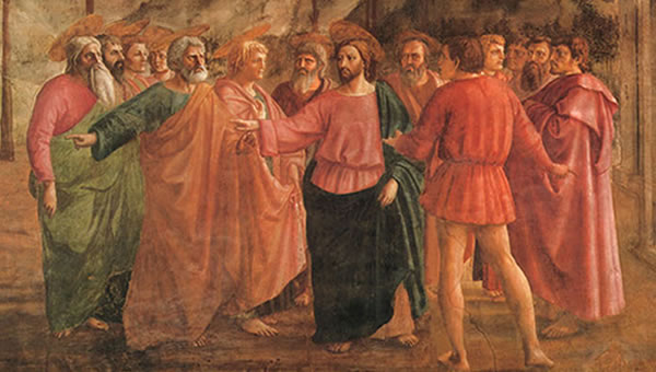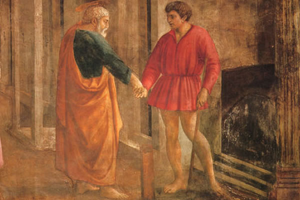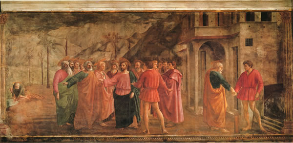 这个宗教故事完全被画家描绘成真实的世俗场面,画中人都是画家同时代的普通百姓,他们按自己的身分和所处的地位,被恰当地安置在真实的自然环境中,符合空间透视法则,具有深远感,人物被塑造得庄严而厚重,结构明确而清晰。瓦萨利说:“马萨乔使他的画中的人物脚踏实地、稳固地站立在土地上。”马萨乔首先注意到光对于表现物体的作用,使画中物象充满了光线与空气;而通过光与空气的描绘,使画面上的人物与环境产生距离的感觉。 马萨乔的艺术探索,为现实主义艺术创作奠定了基础。 |