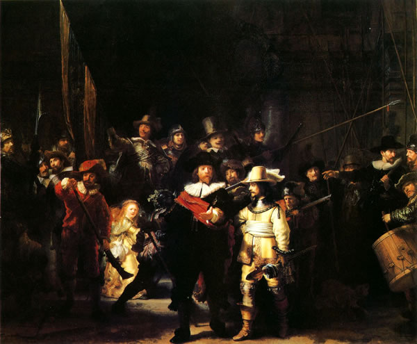 这幅画原来描绘的是白天情景,因年久而呈现深棕色调,被后人误为夜晚,故名《夜巡》。 |