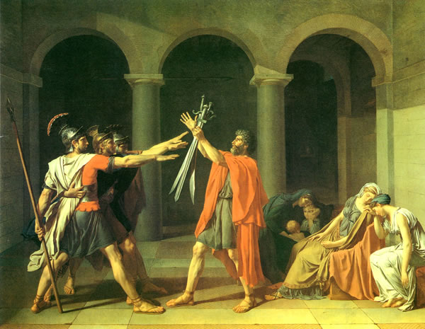 1782年,巴黎重新上演大剧作家高乃依(1606-1684年)1640年创作的悲剧《贺拉斯》。故事写的是罗马城和阿尔贝城之间发生战争,双方谈判各选三位勇士进行决斗以定胜负。罗马城选了贺拉斯三兄弟,阿尔贝城推举了古里亚斯三兄弟,他们之间是亲缘关系,贺拉斯兄弟中老大娶古里亚斯兄弟的姐姐为妻;而古里亚斯兄弟中老三是贺拉斯兄弟的妹妹的未婚夫。这两对三兄弟之间的决斗面临国家利益和个人利益之间的冲突和选择,结果是国家利益至上,大义灭亲,罗马城取得最后的胜利。