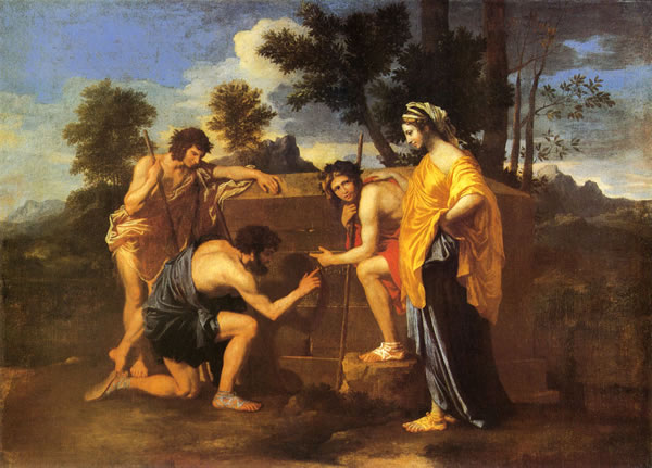 普桑性格沉静、为人耿直,不苟言笑,也不事权贵。他曾研究过希腊罗马古代文明和文艺复兴大师们,尤其是拉斐尔、提香等人的成就,他的艺术素养决定他选择一些具有“崇高风格”的绘画题材,他画的人物也是按照古代希腊、罗马的雕像来造型的。他认为这才符合一种“典范”。《阿卡迪亚的牧人们》正是按此典范创作的。