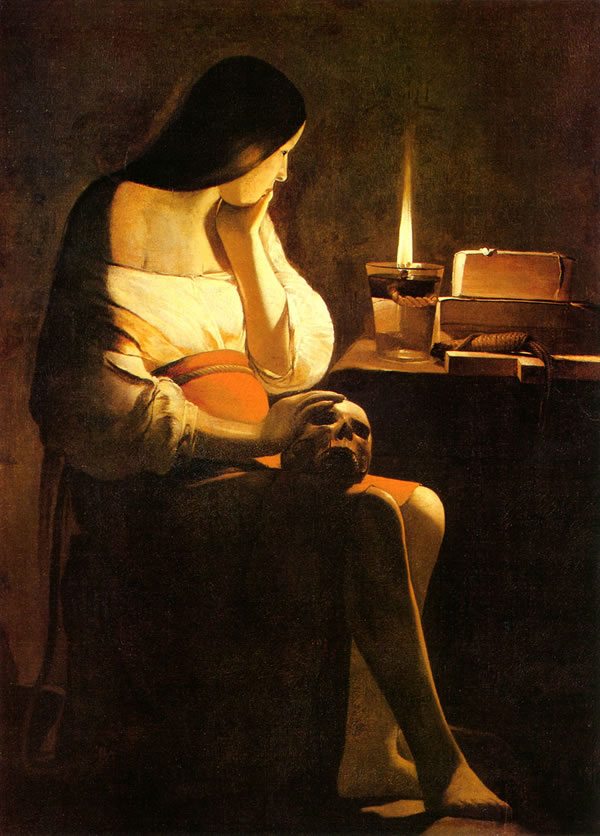 《油灯前的玛达莱娜》是拉图尔的夜间灯光画法的代表作品。画中所描绘的是基督教传统题材,被基督赦免的妓女玛达莱娜在忏悔沉思。画面人物和环境极其单纯,玛达莱娜坐在油灯前,左手托腮,右手抚在置于腿上的耶稣颅骨上,目光似乎专注,实际上深深地沉入自己想象的思绪之中,桌面上堆放着《圣经》读物和悔罪而鞭挞自己的鞭子,画面光源来自桌上的油灯。