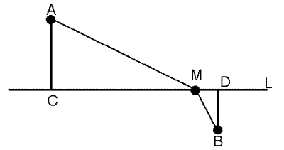 假设,L是一根水平放置的紧张而光滑的铁丝,两个滑轮A、B放置在过L的同一平面上且在L的两侧;L代表题中的定直线,A、B为题中的定点。在铁丝上套一个小环,环上系两根长L1与L2的细线,其中一根线绕过滑轮A,一端挂上重量为p的砝码P1;另一根线绕过滑轮B,一端挂上一个重量为q的砝码P2 。假定铁丝不弯曲,小环和铁丝没有摩擦,可自由滑动,线和小环的重量可忽略,L1和L2不伸长,我们说,这个力学装置处于平衡状态 时与p·AM + q·BM达到最小是等价的。而由这个力学装置处于平衡状态,便能得出p·sin∠CAM=q·sin∠DBM 。 |