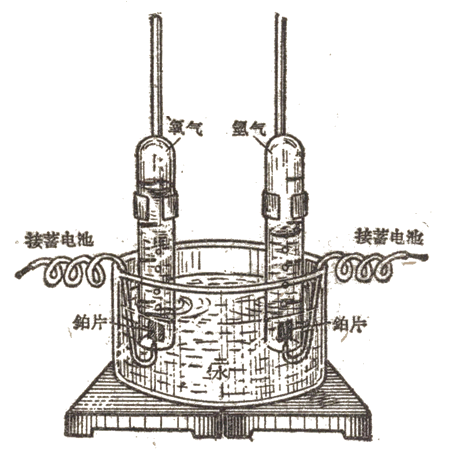 在玻璃缸内盛水②约2/3,另用铁架台固定住两个有刻度的试管,试管盛满水倒立在玻璃缸里。在试管口处各有铂片一小块(作为电极),用导线把铂片和蓄电池的两电极相连。当导线接通后,不久就可看到铂片上有气泡不断产生,试管里的水不断被排出。经过一定时间后,可以看到一只试管里的气体体积正好是另一只试管里的两倍