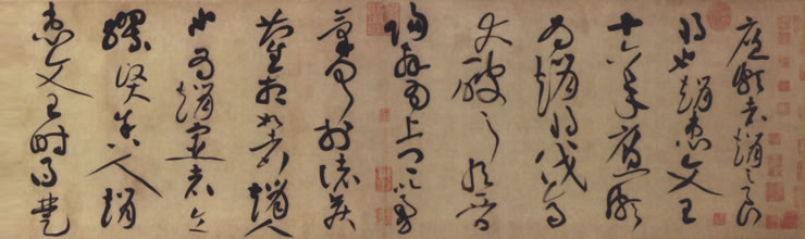 收藏者:美国大都会博物馆说明明:该字幅是黄庭坚的大草作品。创作上,融合了张旭、怀素等人的风格,加进了他的楷书基础,写出了独特的面貌。其意铿说明 明:锵沉着、其形欹侧多姿、其气势韵致连贯。